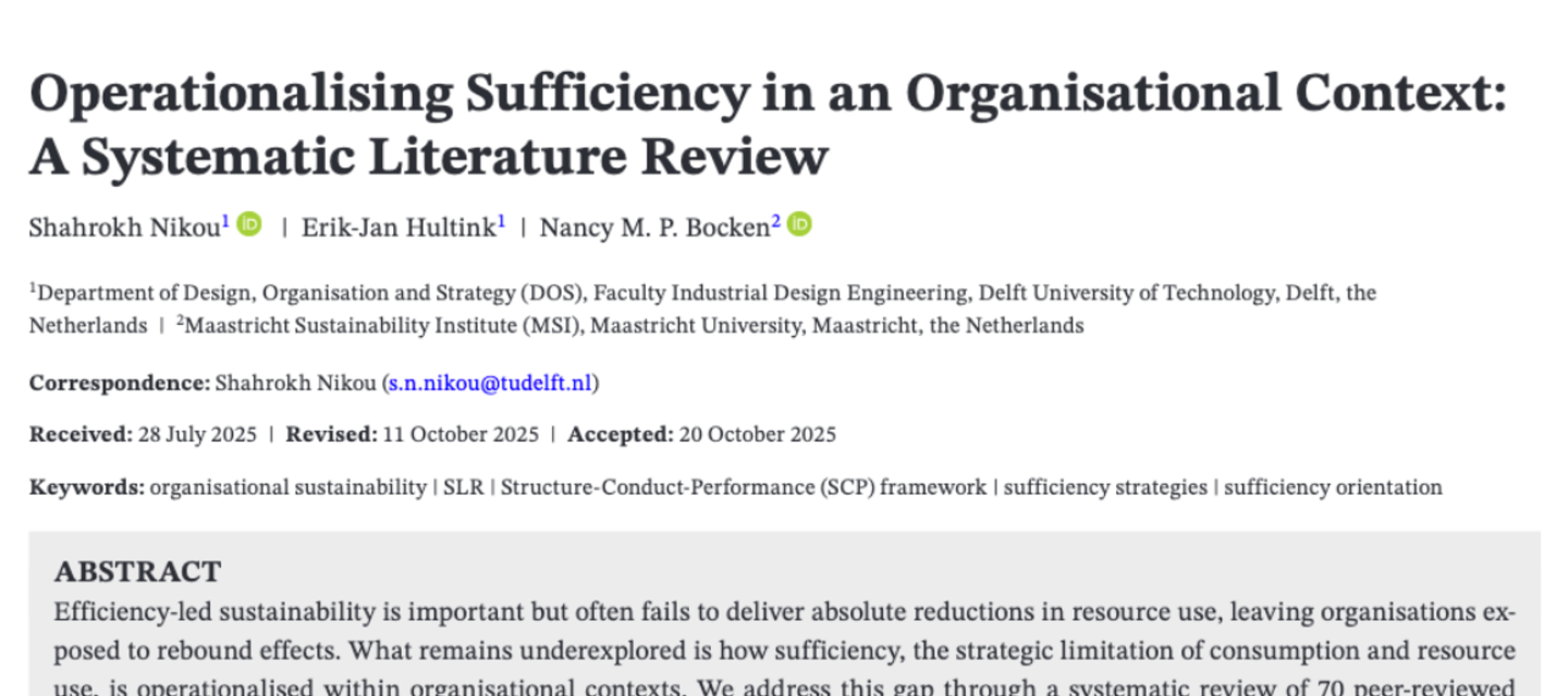This new study by Shahrokh Nikou and Erik-Jan Hultink from TU Delft, and Nancy Bocken from Maastricht University published in Business Strategy and the Environment investigates sufficiency in an organisational context. Efficiency-led sustainability is important but often fails to deliver absolute reductions in resource use, leaving organisations exposed to rebound effects. Through a systematic review of 70 peer-reviewed studies, using the Structure-Conduct-Performance (SCP) framework to connect enabling conditions, organisational practices and sustainability performance the study identifies eight thematic clusters reflecting how sufficiency is enacted across domains such as governance and policy, organisational practices, social norms, and infrastructural systems. Building on these, a typology of five strategic types is developed through which organisations operationalise sufficiency.